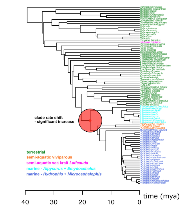 The paper studied Australia’s sea snakes, which split off from our terrestrial venomous snakes or elapids, about 17 million years ago. Elapids include species such as tiger snakes and taipans, and arrived in Australia less than 40 million years ago.