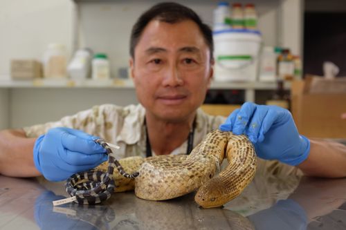 Dr Lee can be seen above with examples of both narrow and broad-headed sea snake specimens.